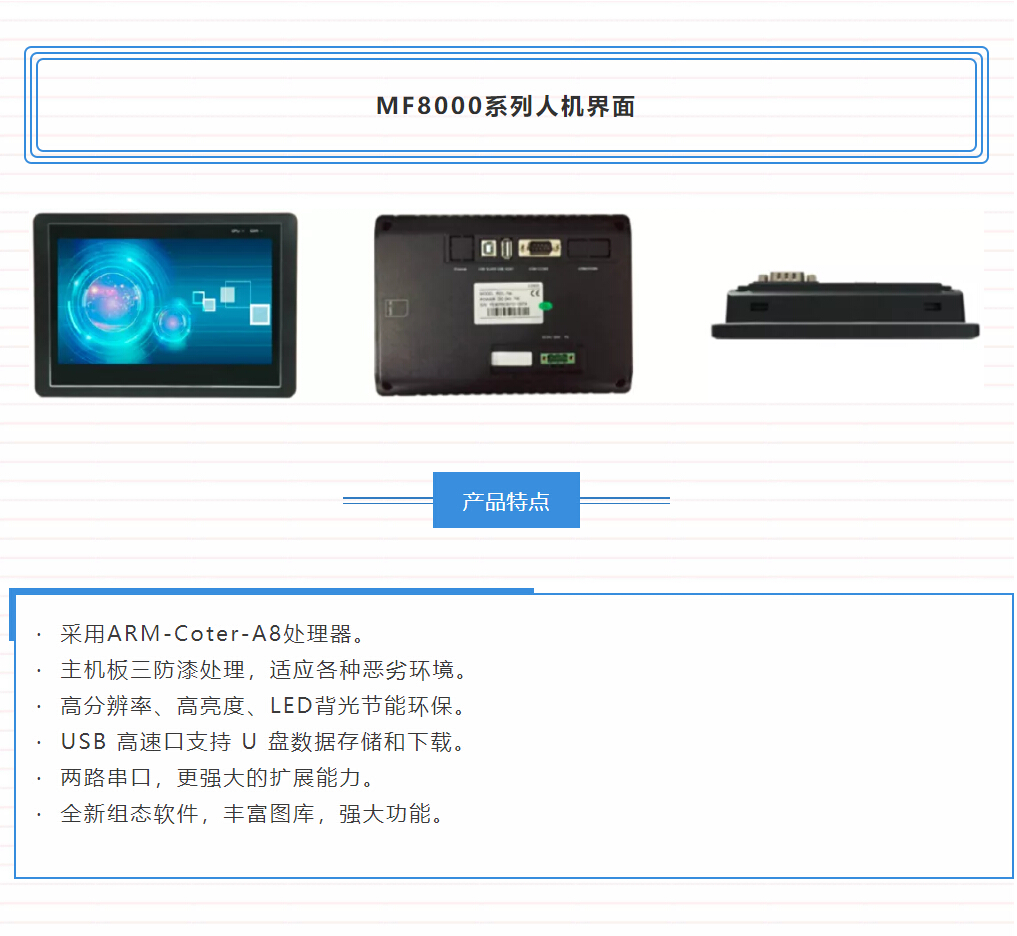 下面以武漢邁信電氣技術(shù)有限公司的MF8000系列人機界面為例詳細講解配方的使用,用配方的方式來更改伺服的運動位移,速度等參數(shù)。