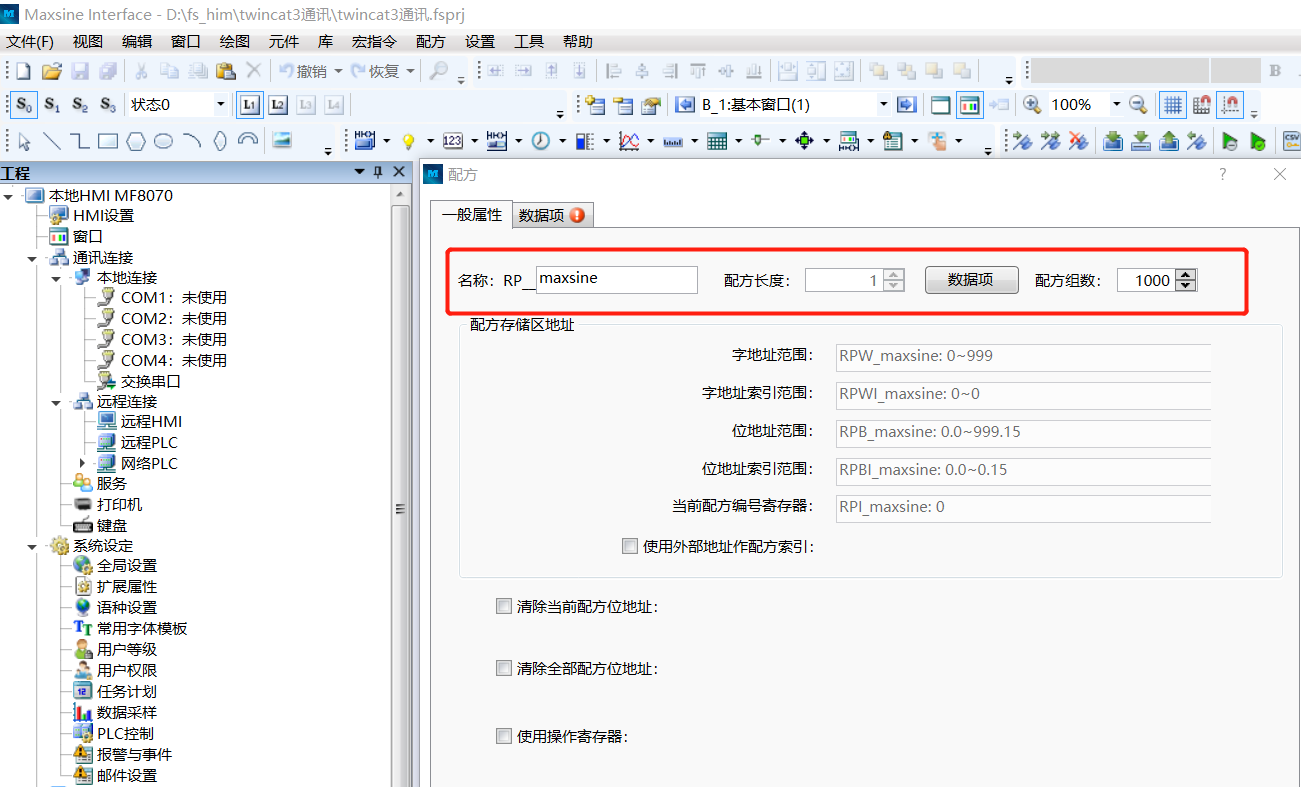 1.1 點擊工具欄“配方→新建配方”,出現(xiàn)以下窗口。一般屬性中如圖示取名“maxsine”調(diào)節(jié)配方組數(shù)長度。