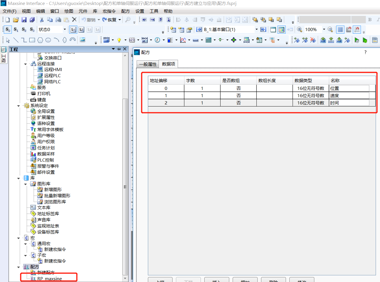 由上圖可以看出,點擊“新建配方”后,在“名稱”欄后會有一個輸入框,在此處輸入的“名稱”就是該新建配方的寄存器名稱。該名稱可以是中文、數(shù)字、字母等,其中前面的“RP_”為固定內(nèi)容,表示是“配方寄存器”。譬如,我們在名稱框內(nèi)輸入“maxisne”,那么軟件的配方條目中,會增加一“RP_maxsine”的條目,且其使用的寄存器名稱也是“RPW_maxsine”,即“RP_ maxsine”名稱的配方所使用的字寄存器。