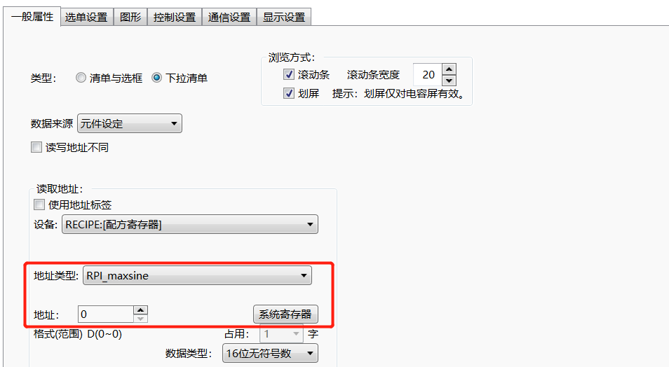 此為可選項,默認(rèn)不勾選。當(dāng)勾選此項后,可以定義一個自定義的字地址,作為配方索引寄存器,這樣前面的“當(dāng)前配方編號寄存器”就不在起作用, 譬如此例的說明中,如果勾選了該選項“RPI_maxsine:0”這個寄存器就不再作為“RP_maxsine”這個配方的索引地址了。