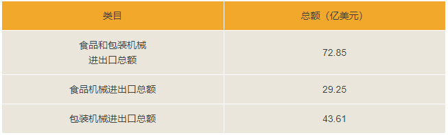 海關(guān)統(tǒng)計(jì)數(shù)據(jù)顯示,2015年中國(guó)食品和包裝機(jī)械進(jìn)出口總額72.85億美元,其中,食品機(jī)械進(jìn)出口總額29.25億美元,包裝機(jī)械進(jìn)出口總額43.61億美元。